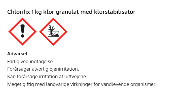 Info: 1 gr. Chlorifix pr. m3 tilfører 0,56 mg/l fri klor og 0,50 mg/l. cyanursyre – 20 gr. pr. m3 tilfører (0,56×20) 11,5 mg/l fri klor og 10 mg/L cyanursyre