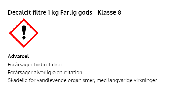 Decalcit granulat filterrens for afkalkning og rensning direkte i sandfilter. Kan også opløse snavs i patronfiltre ved opløsning i Spand med 10 % blanding. Indeholder ikke saltsyre. Uegnet til ikke syrefaste materialer.