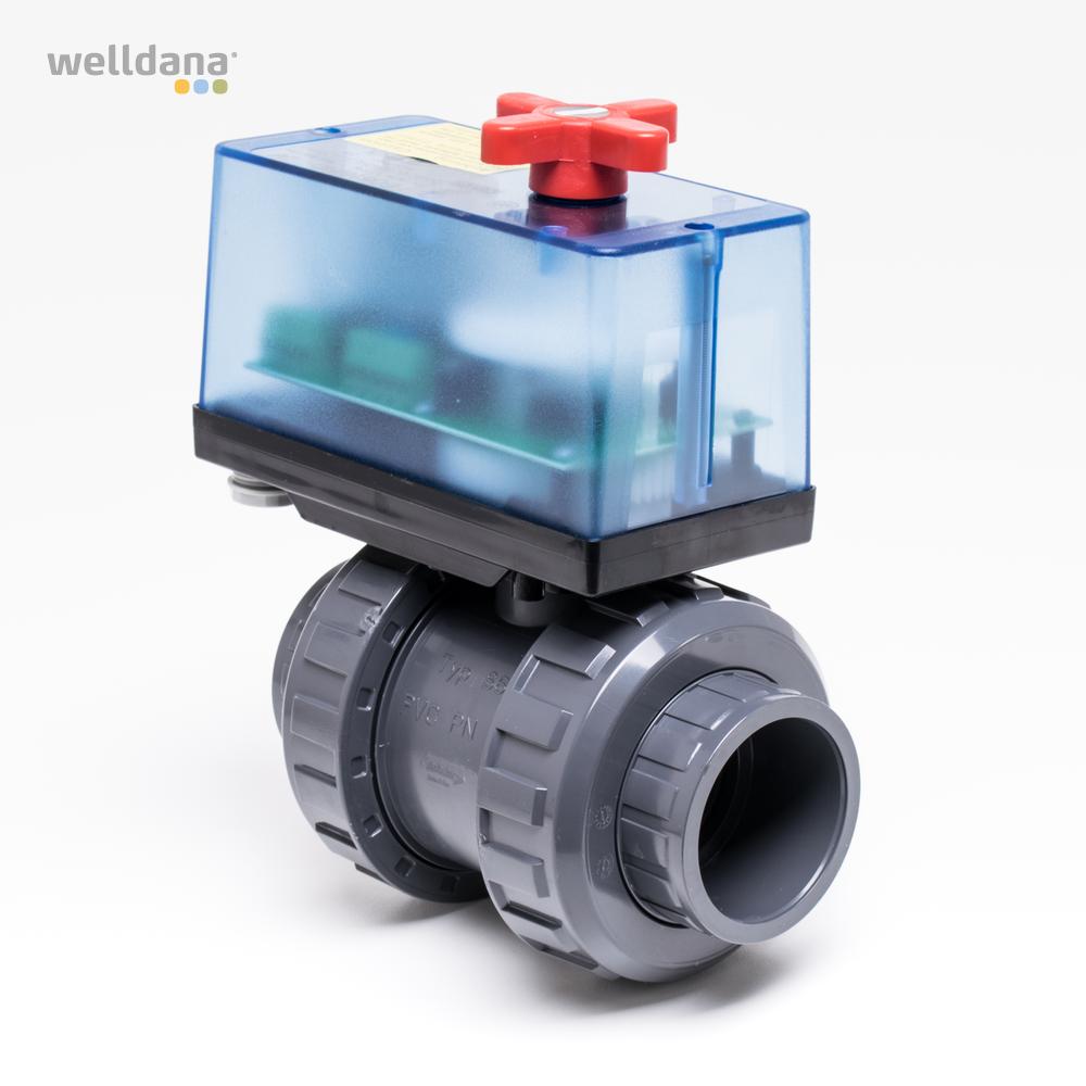 Welldana® 2-vejs motorventil i kraftig grå PVC fittings.