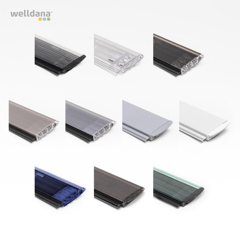 Lamellerne fås i to forskellig materialer, PVC og polycarbonat. Begge fås i forskellige farver, som kan ses på billederne til venstre.