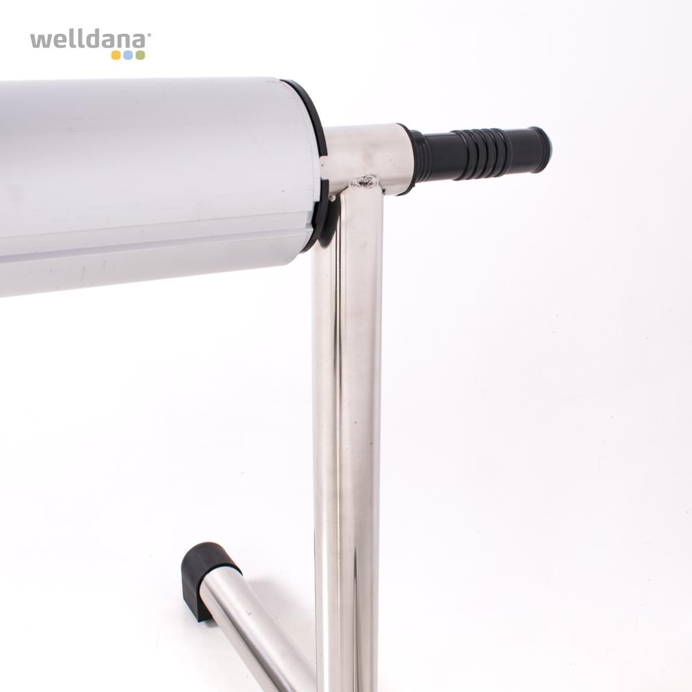 Welldana® Rustfri oprulningsstativ m/ hjul for termodækken til pool. Produceret i solid rustfristål med plast bøsninger, beslag for 3” teleskoprør og hjul. Ideel for udendørs pool, hvor stativet skal flyttes når poolen er i brug. Leveres usamlet uden teleskoprør (32-001005). Der medfølger Bændelsæt.