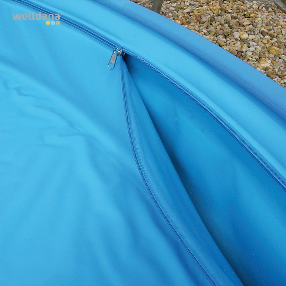 Wellnana® Top pool cover er et stærk pool dækken med lynlås. Fremstillet i et kraftigt kvalitets specialfolie med YKK lynlås. Det tåler en belastning op til 100 kg og kan bruges hele året. Det monteres under toplisten og kan let eftermonteres i pool med ”liner lock” toplisten. For sikkerhed, anbefaler vi en mini dykpumpe til regnvand på coveret(evt. 36-189050)