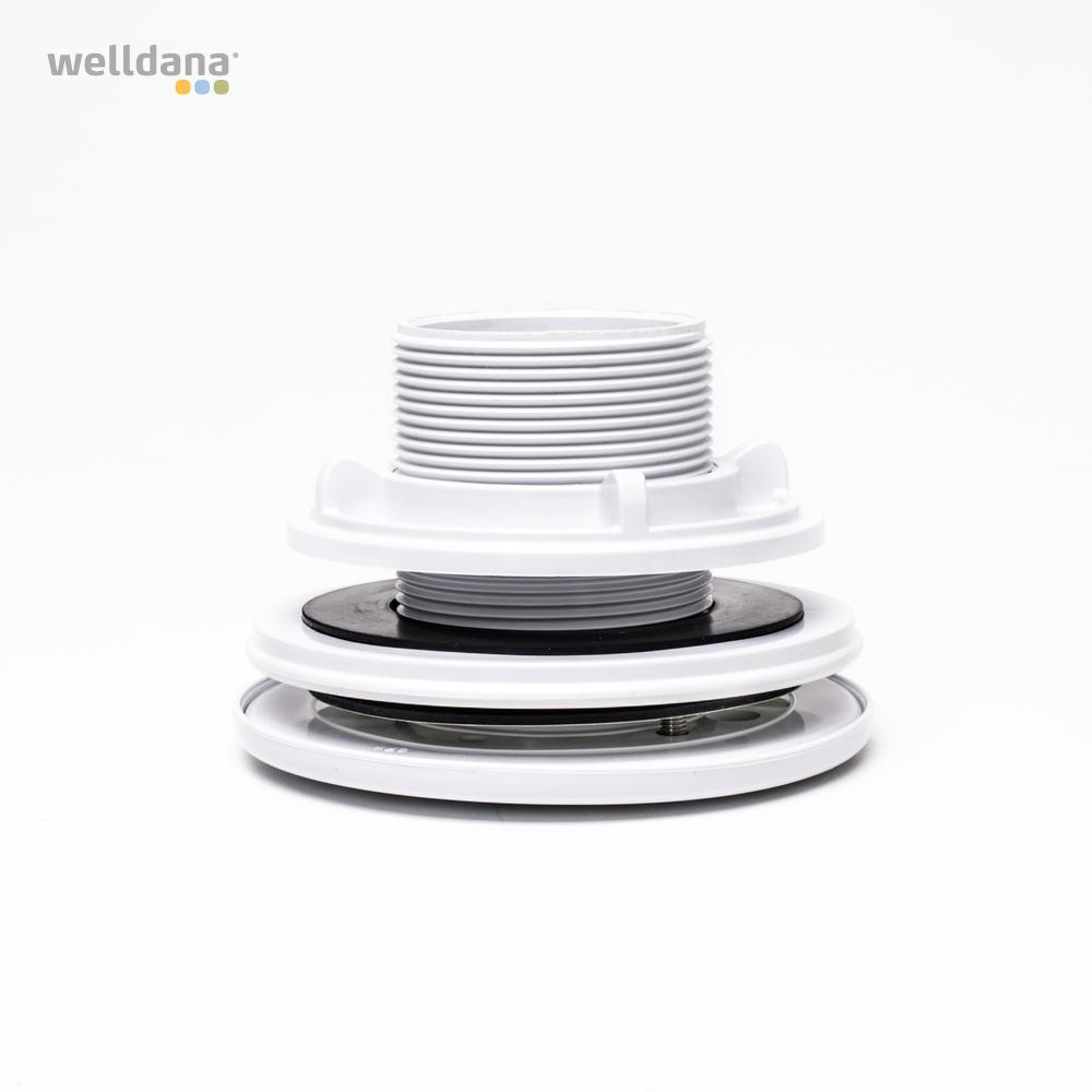 Moteres med liner mellem de to sorte gummipakninger. Den hvide flange og møtrikken på yderside af poolen.