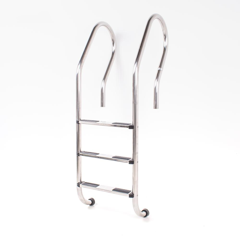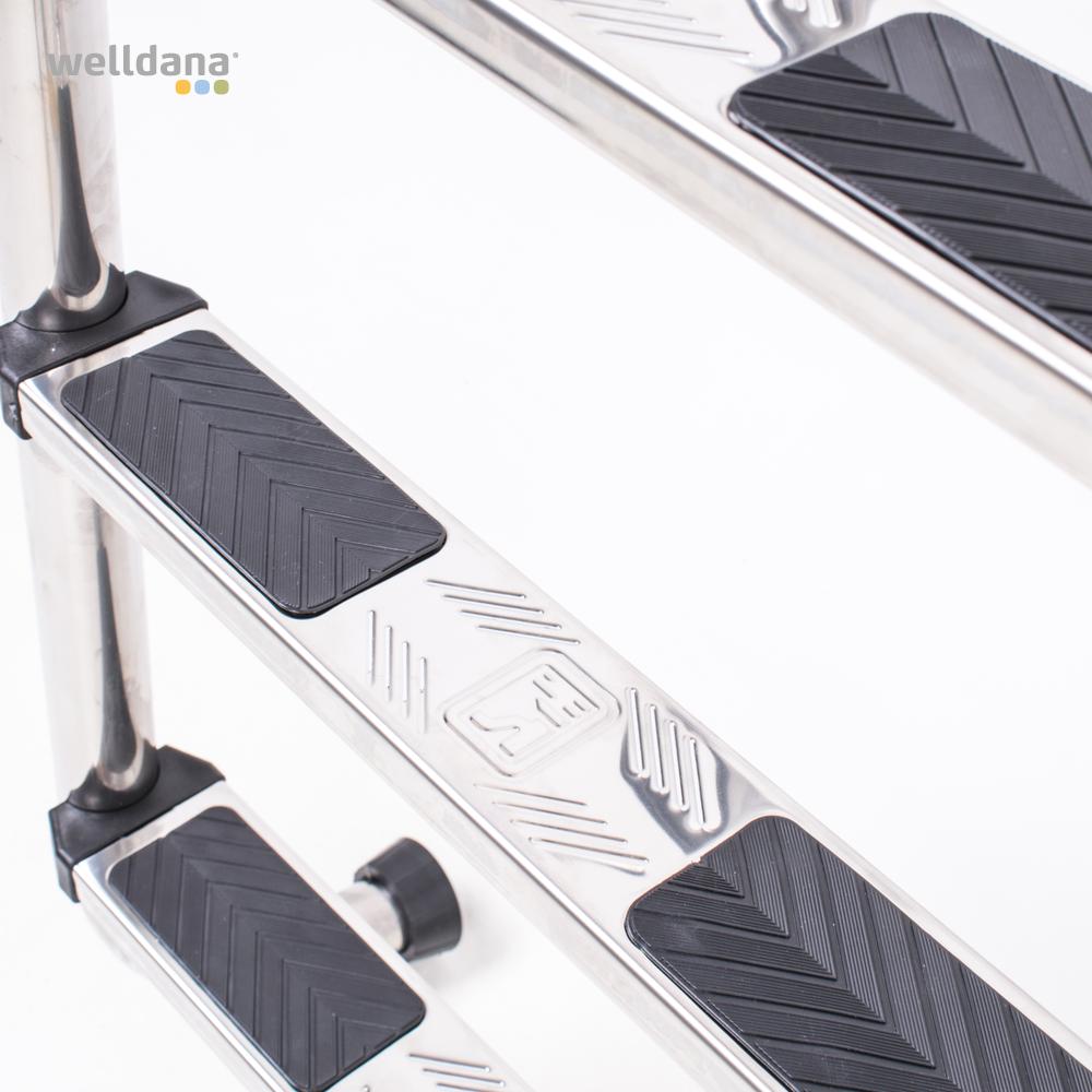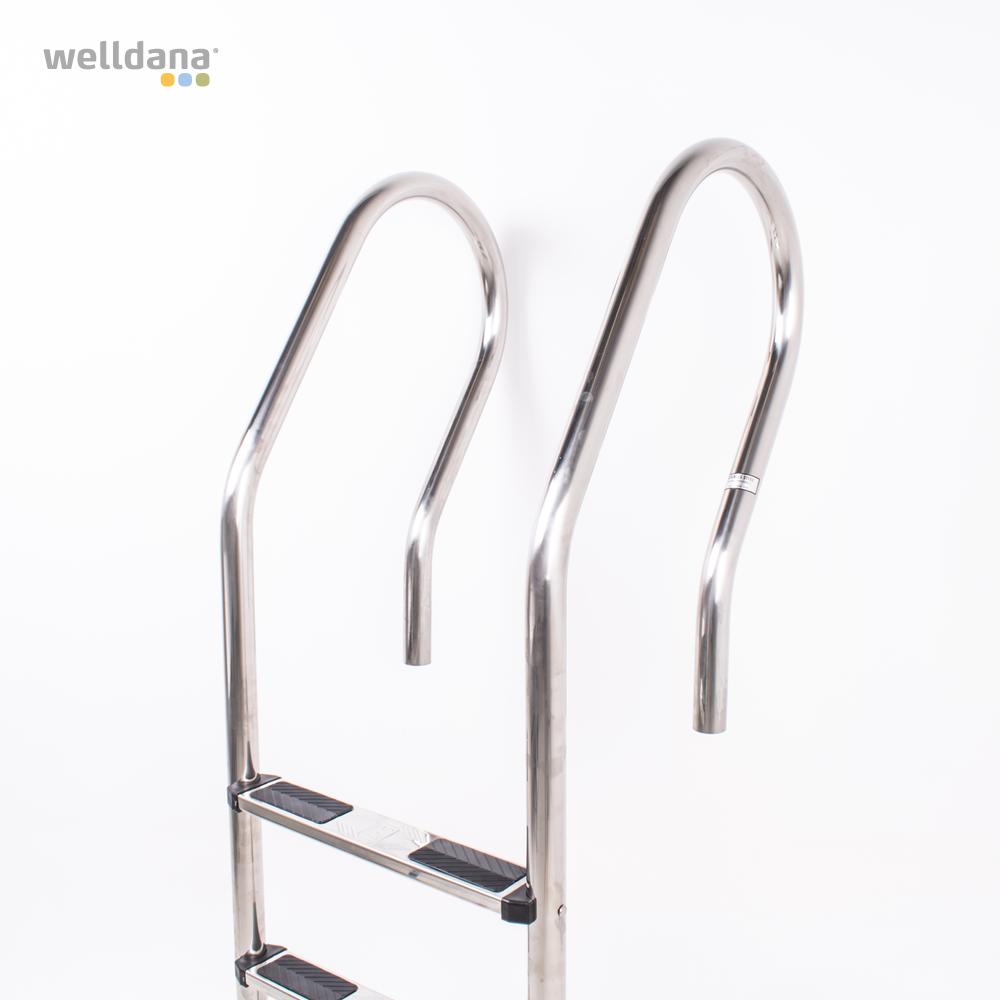 Welldana® klassik stige til nedgravet pool. Fremstillet i solid Ø43 mm klarpoleret rustfristål og med skridsikre rustfri trin. Leveres usamlet, komplet med nedstøbningsbeslag og kraftige gummirørpropper for god beskyttelse ved anlæg på i poolen.