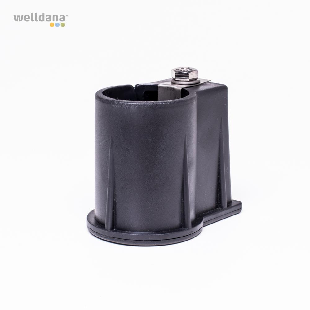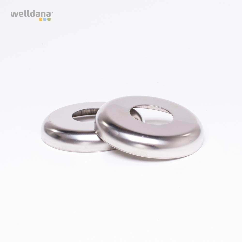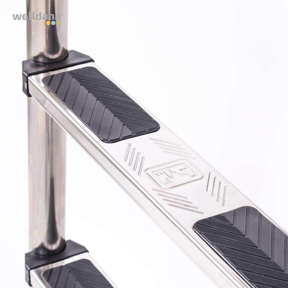 Welldana® Stige i smal design. Fremstillet i solid Ø43 mm klarpoleret rustfristål og med skridsikre rustfri trin. Leveres usamlet, komplet med nedstøbningsbeslag og kraftige gummifødder for god beskyttelse af poolsiden.
