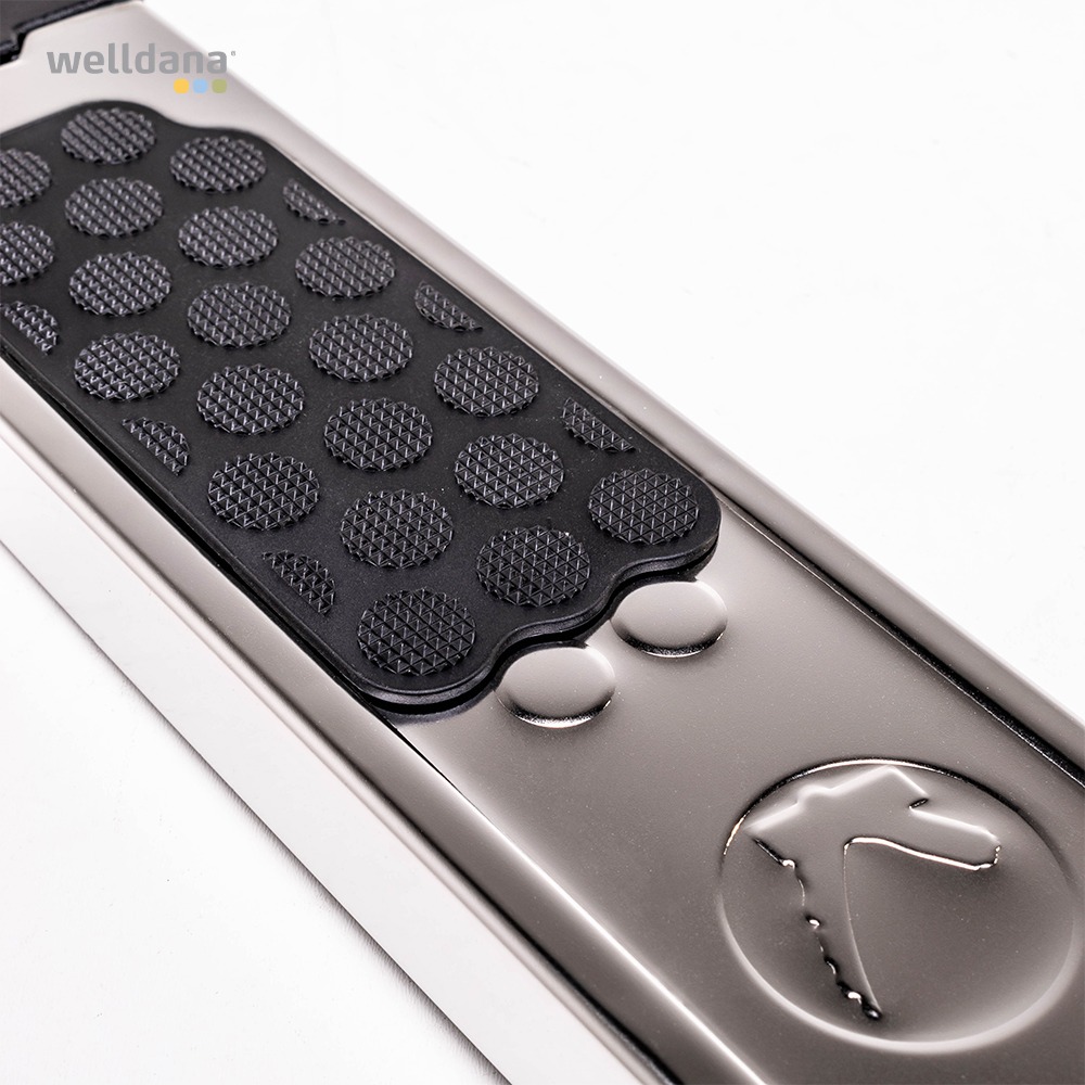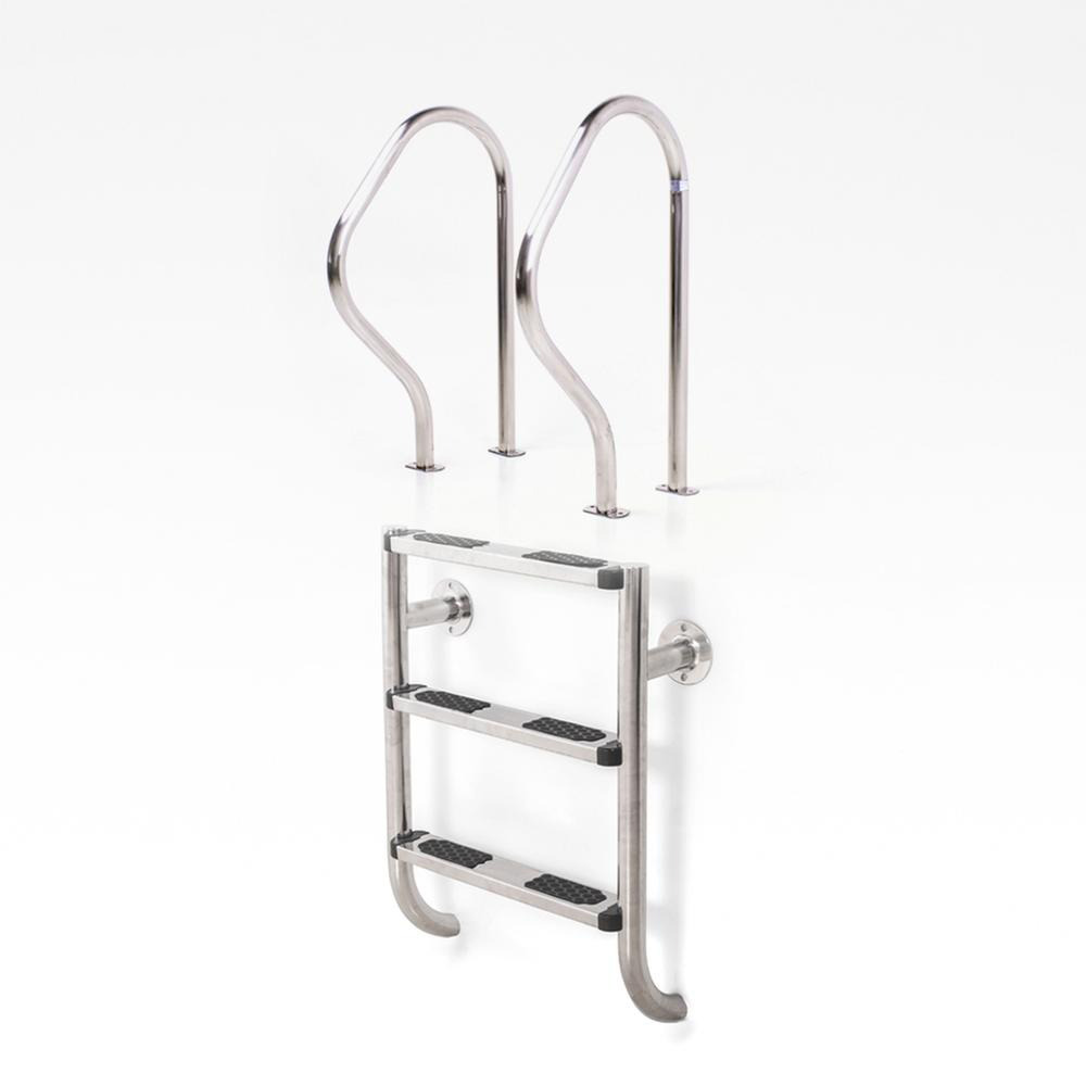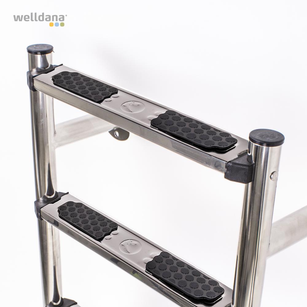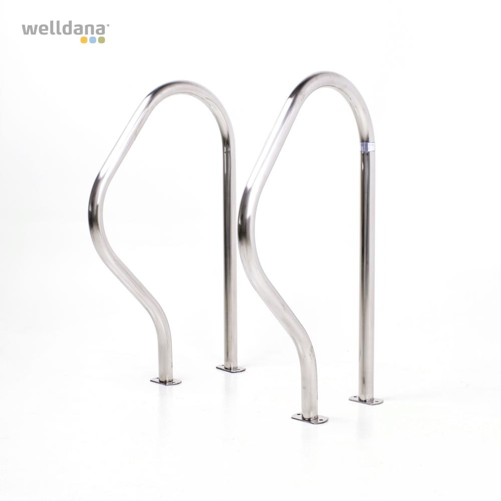 Welldana® 2-delt stige til nedgravet pool. Fremstillet i solid Ø43 mm klarpoleret rustfristål og med skridsikre rustfri trin. Leveres usamlet, komplet med påboltningsbeslag og kraftige gummifødder for god beskyttelse af poolsiden.