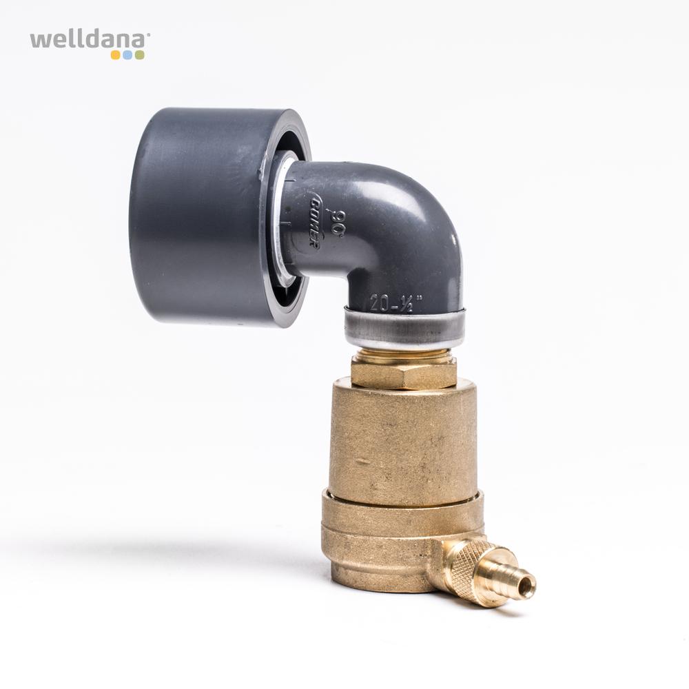 Automatisk 2 vejs udluftningsventil i messing til solvarmeanlæg. Monteret på PVC vinkel med overgang for 50 mm muffe. Max tryk. 8 bar