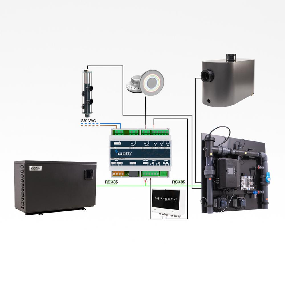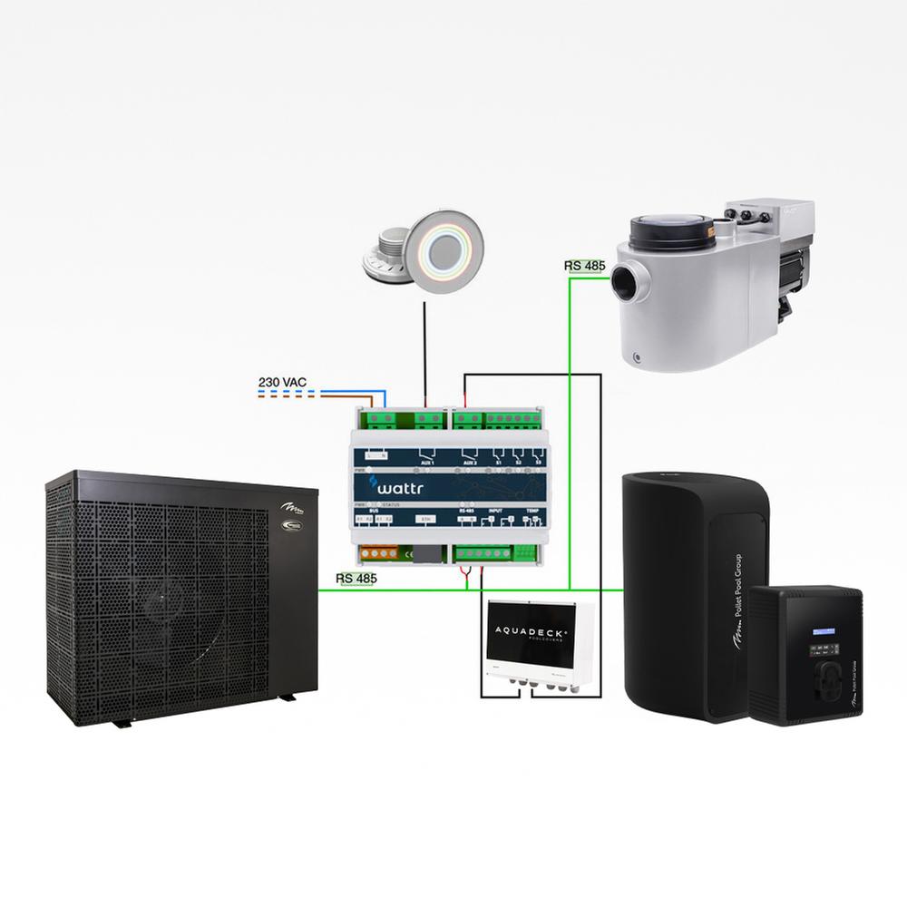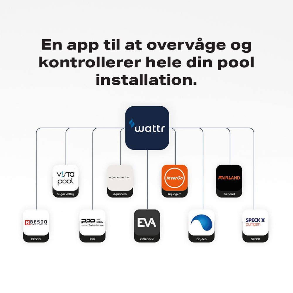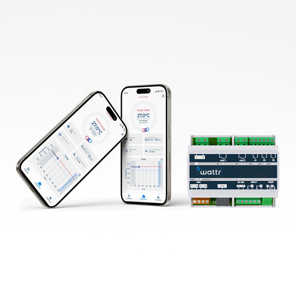 Den er baseret på RS485 teknologi og derfor kan den overtage driften af varmepumpen og optimere driften af den, hvor WATTR tager hensyn til, hvornår varmepumpen yder mest og ligeledes tager den vejrudsigten i betragtning, når den planlægger, hvornår poolen skal varmes op. Alt pooludstyr der kan kommunikere med RS485 kan kobles til WATTR og du har dermed alt dit udstyr samlet i en app.