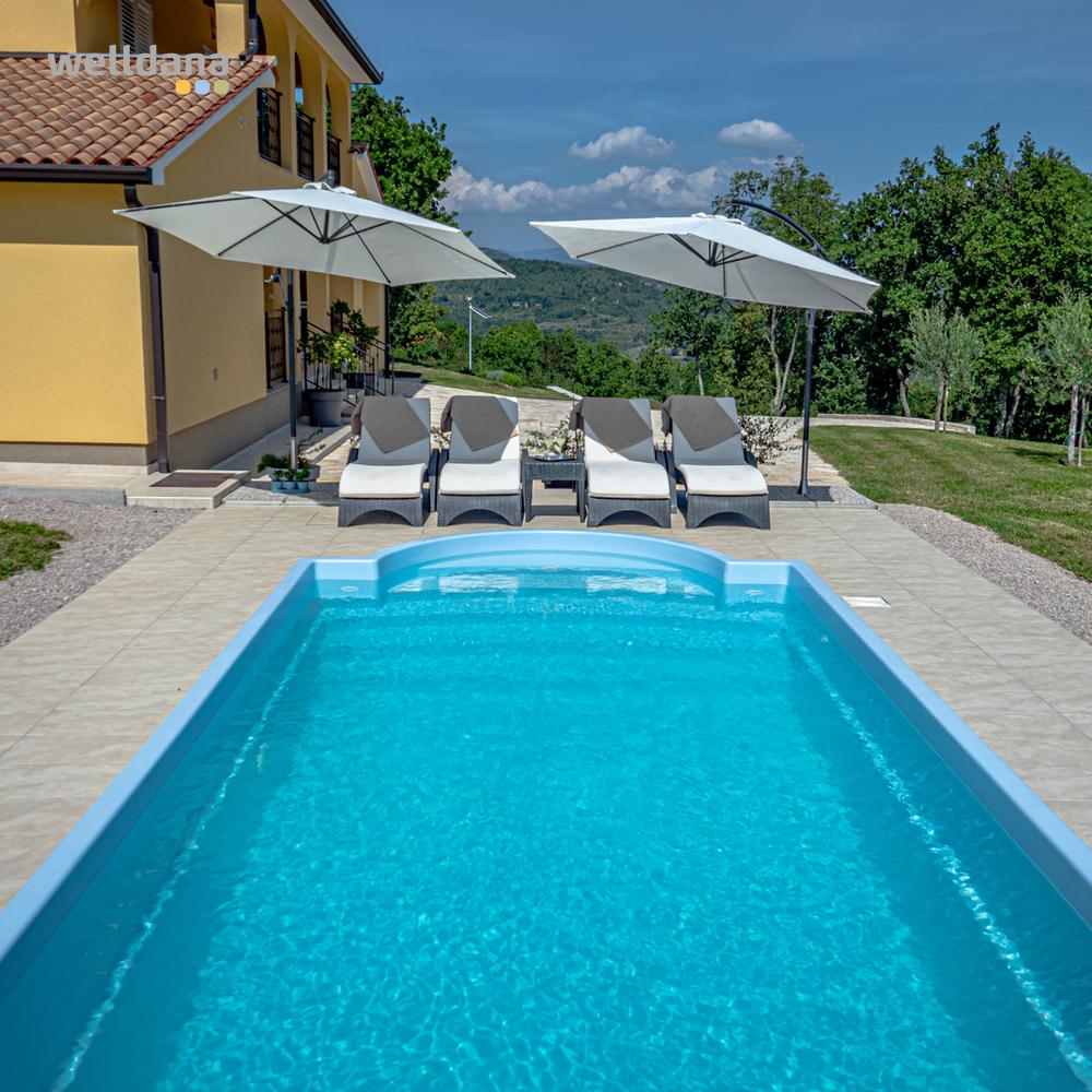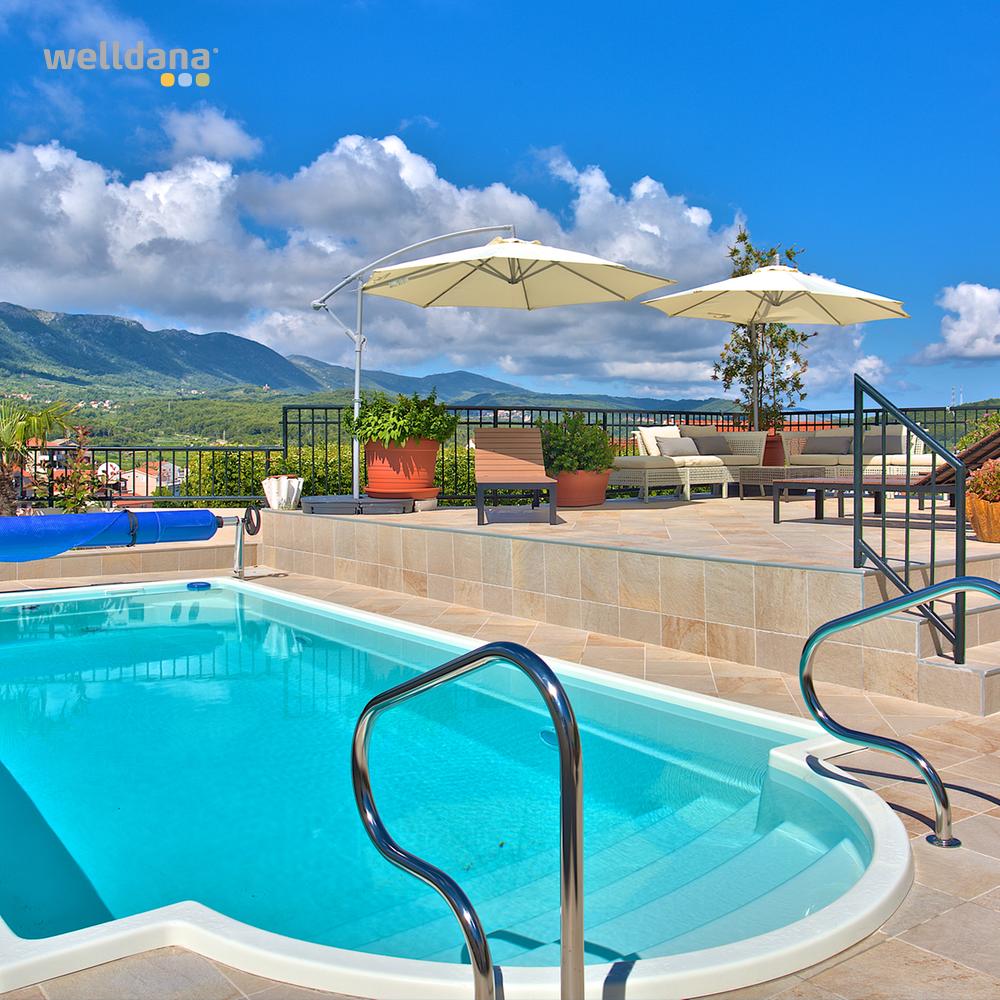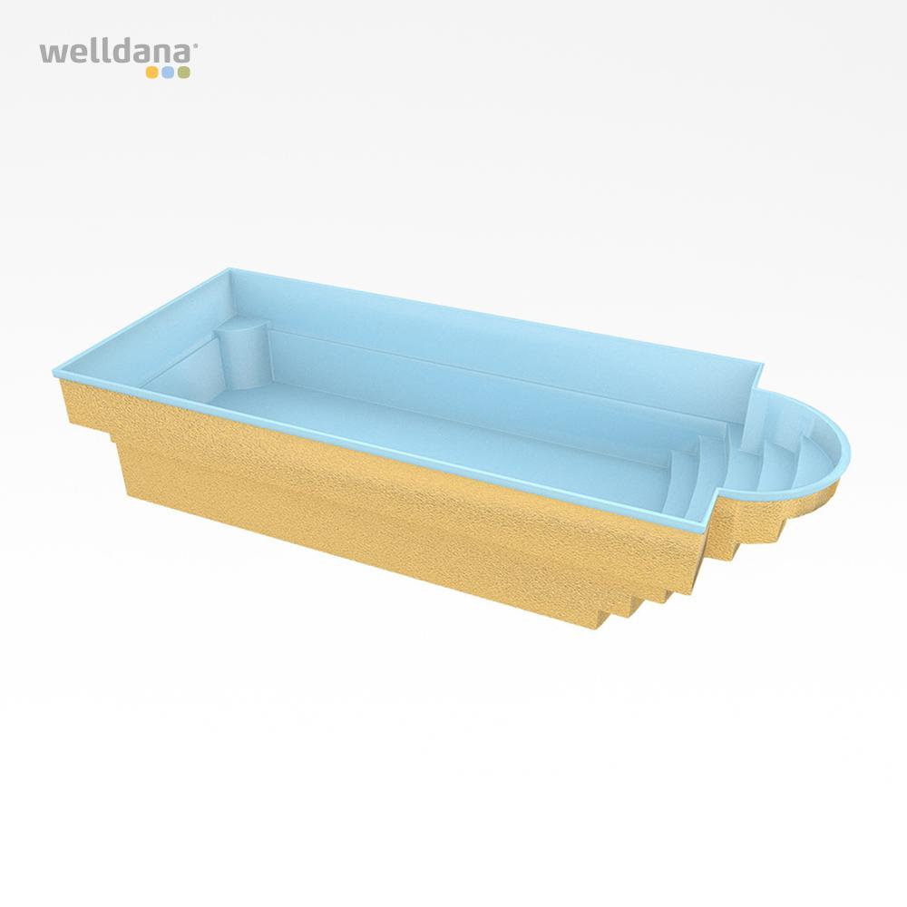 Welldana® Fiberpool model London, en høj kvalitets flot pool fremstillet i 3 lags glasfiberarmeret polyester, forstærket med gelcoatet vinylester og keramisk belægning. Overfladen er sprøjtemalet med en meget miljøvenlig, UV hæmmende og stærk kvalitets maling, for super flot finish. Leveres standard isoleret med ca. 20mm påsprøjtet polyurethan isolering. Monteres nedgravet på fast underlag med støbte sider.