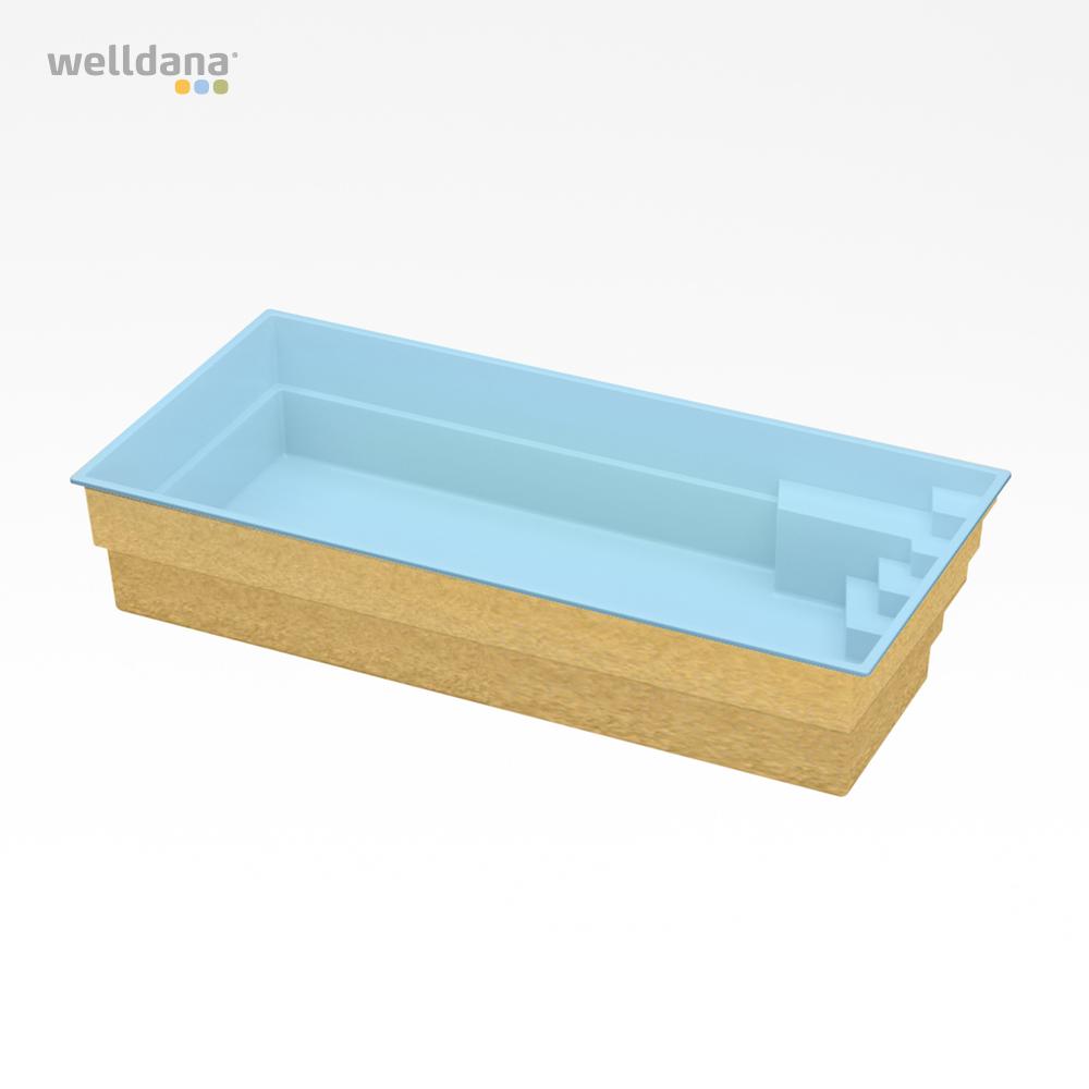 Welldana® Fiberpool model Madrid, en høj kvalitets flot pool fremstillet i 5 lags glasfiberarmeret polyester, forstærket med gelcoatet vinylester og keramisk belægning. Overfladen er sprøjtemalet med en meget miljøvenlig, UV hæmmende og stærk kvalitets maling, for super flot finish. Leveres standard isoleret med ca. 20mm påsprøjtet polyurethan isolering. Monteres nedgravet på fast underlag med støbte sider.