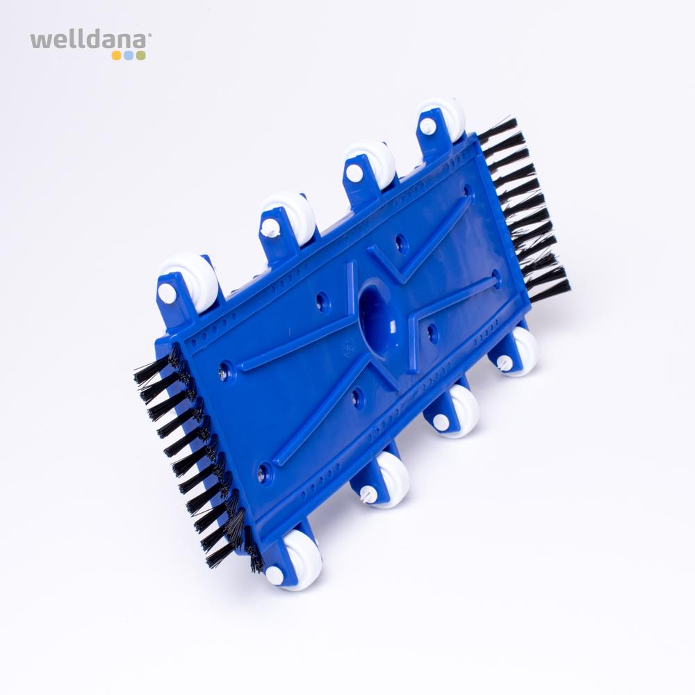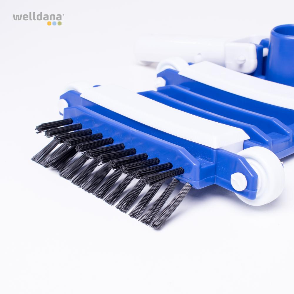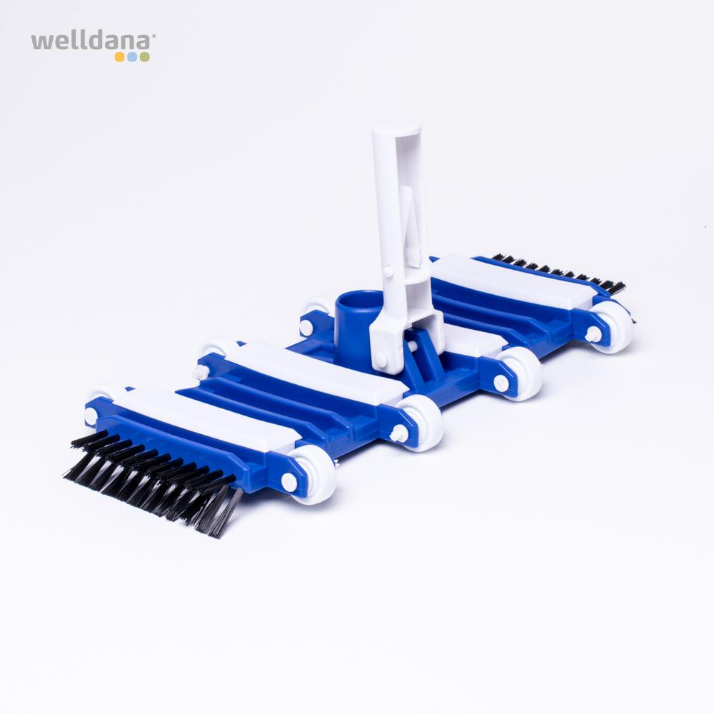 Welldana® Kvalitets flexsugehoved, fremstillet i kraftig plast. Er let at arbejde med i lange baner og suger sig ikke fast på bunden. 1200 g vægtklodser. 12 x 34 cm fleksible sugehoved. Retningsstabiliseret med 8 stk. hjul. Side – og bundbørster. Sugestuds for 38 mm slange. Håndtag for standard teleskopstang.