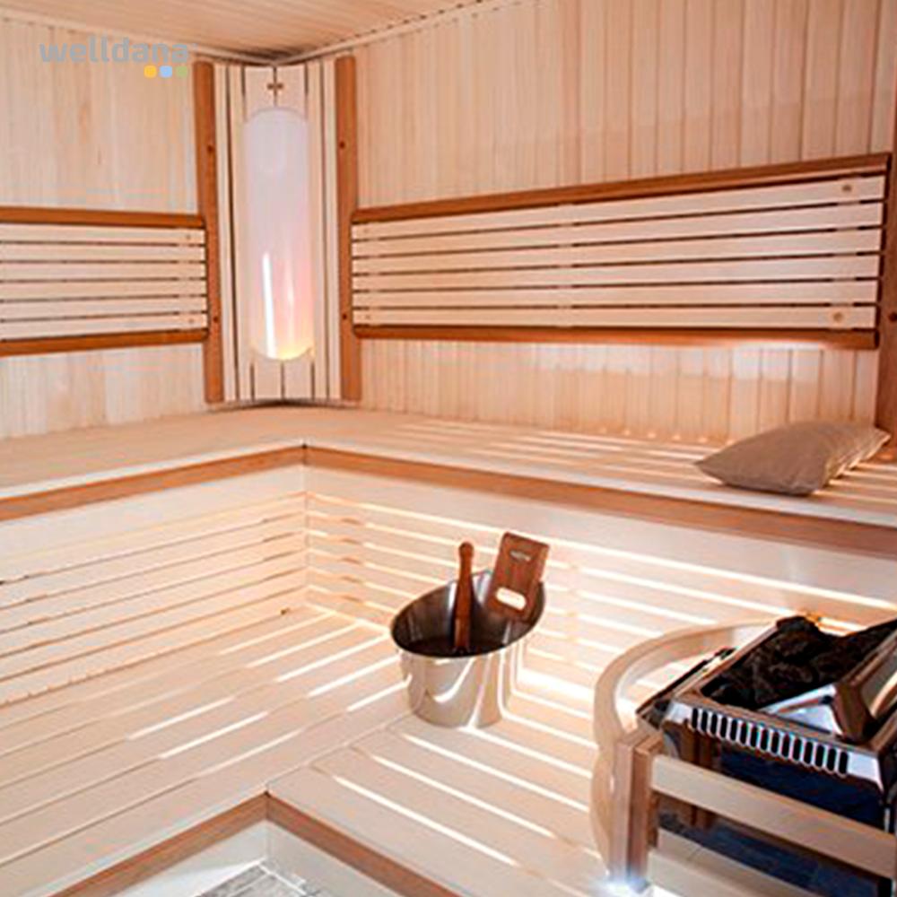 Harvia Rondium saunakabine er en eksklusiv sauna serie, udstyret med topklasse interiør og udstyr. Designet i moderne finsk stil, ergonomisk og efter de originale finske saunatraditioner. Leveres standard komplet i en høj Aspetræ kvalitet og med en passende størrelse elektrisk kombi saunaovn med saunasten og vandtank, placeret op af en dekorativ stenvæg. Derudover medfølger Griffin Combi betjeningspanel, lys, nakkestøtte, glasdør og tilbehørssæt. Kabinen er forholdsvis let at opstille, kræver min lofthøjde på 218 cm. Forhør gerne Welldana® salgsteam om tilbud på udstyrs muligheder.