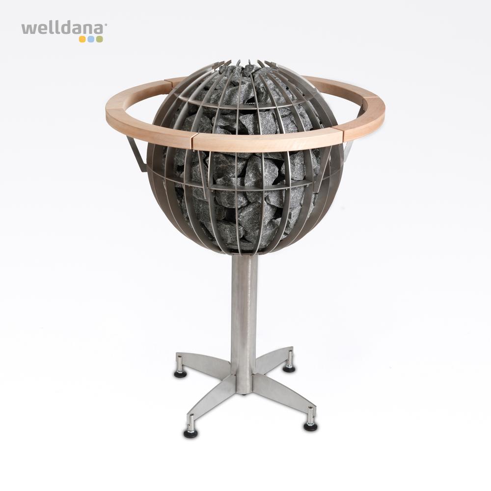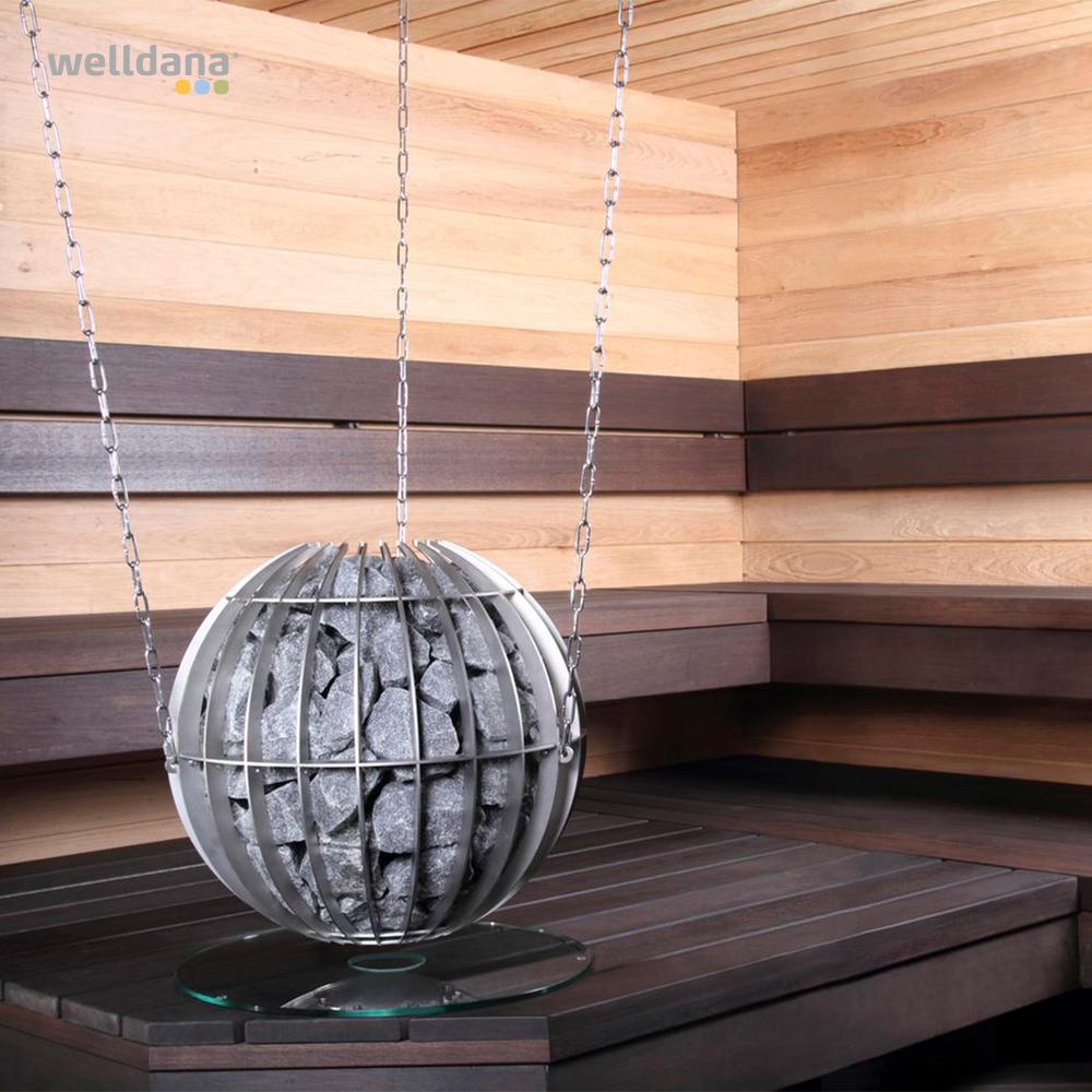Den åbne kugleformede struktur i rustfrit stål, gør det muligt at påføre vand både oppefra og på siden. Selv ved lave temperaturer får du en unik sauna oplevelse.