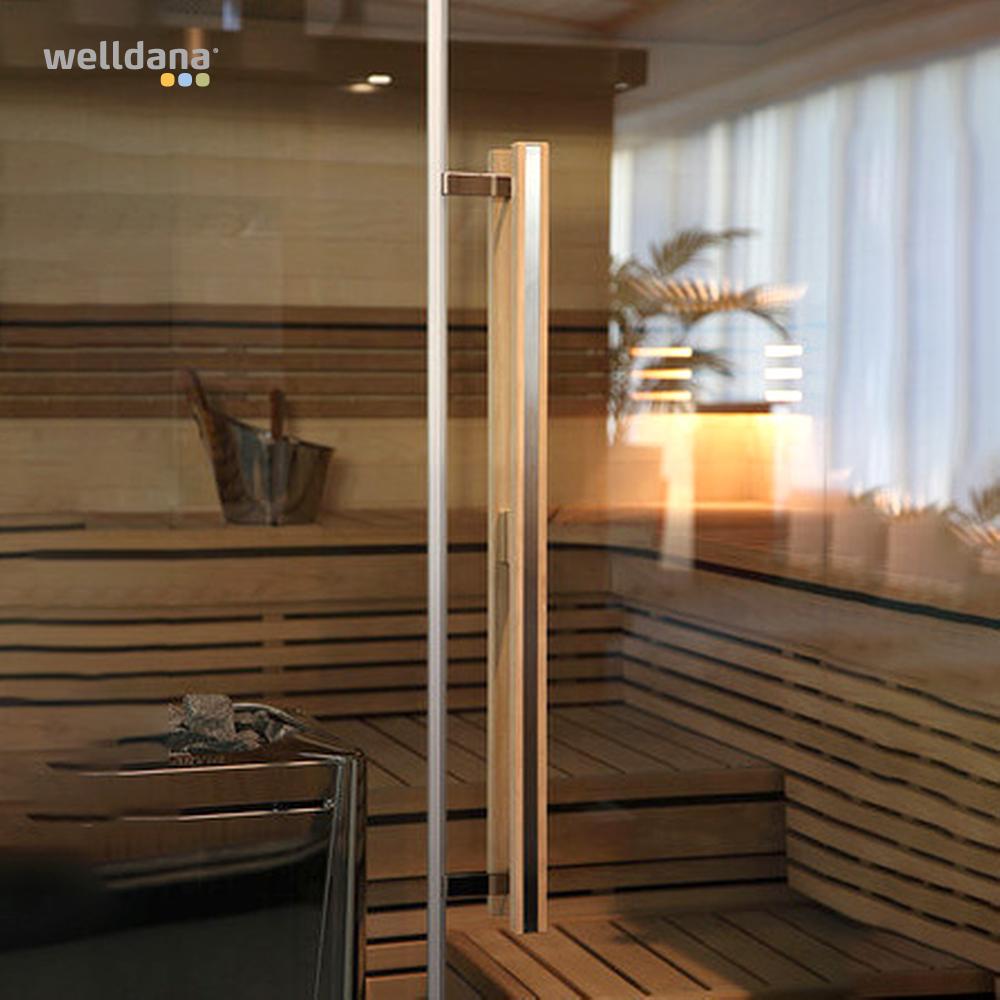 Det krompletterede dørgreb fra Harvia er et stilfuldt element, der er kompatibelt med de fleste saunaindretninger.