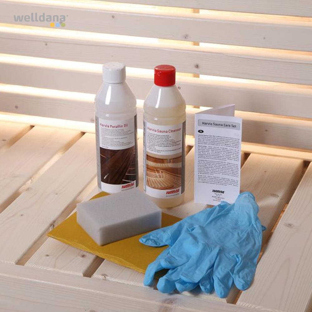 Indeholder: 1 flaske rense- og desinfektionsmiddel til saunaen (500 ml), paraffinolie (500 ml), en svamp, beskyttelseshandsker og sandpapir.