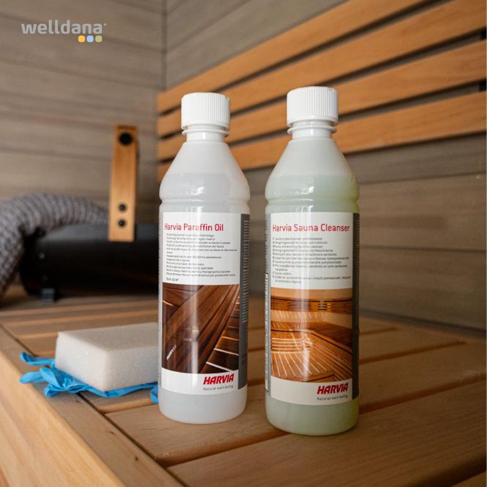 Saunaplejesættet er designet til behandling af saunaens træoverflader og rengøring af saunafaciliteterne.