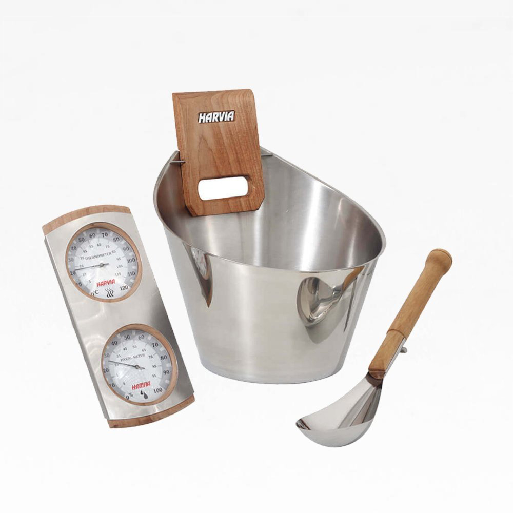 Saunasættet fra Harvia, indeholder en spand af rustfrit stål, øse og en letaflæselig termometer med hygrometer. Rustfrit stål er særdeles modstandsdygtig overfor de store udsving, der er i både temperatur og luftfugtighed.