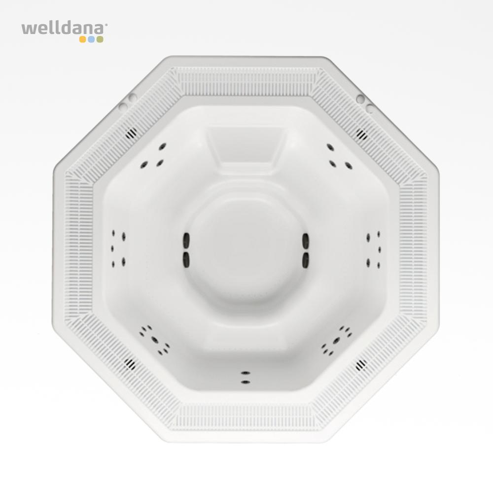 Welldana® model Vesta er en 7 personers offentlig spa serie, komplet produceret i Europa. Er fremstillet i 5 mm kraftig gennemfarvet sanitetsakryl, forstærket med glasfiber på bagsiden for god og sikker stabilitet. Modellen tilbydes standard i 3 forskellige udstyrs varianter og som skimmer- eller overløbsversion. Alle er med integreret luftmassagehuller i bunden og leveres med et kraftigt stel med justerbare fødder.