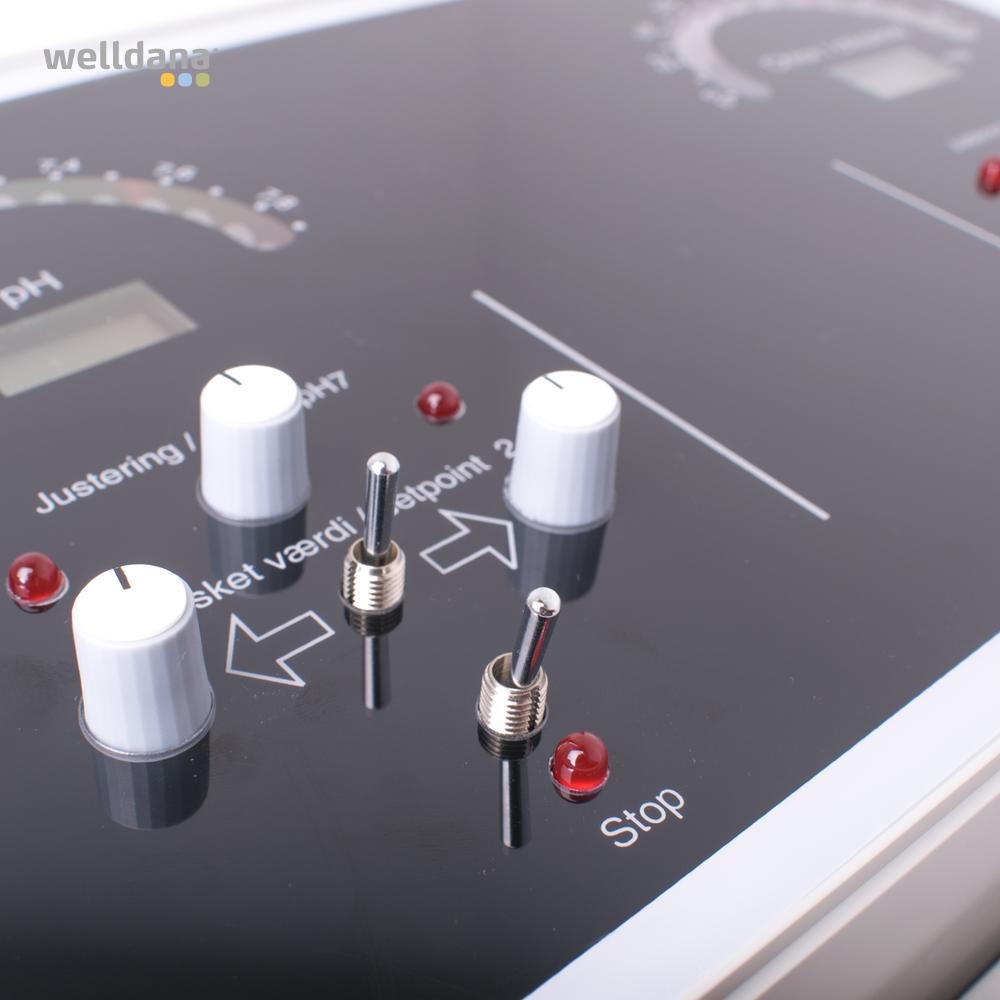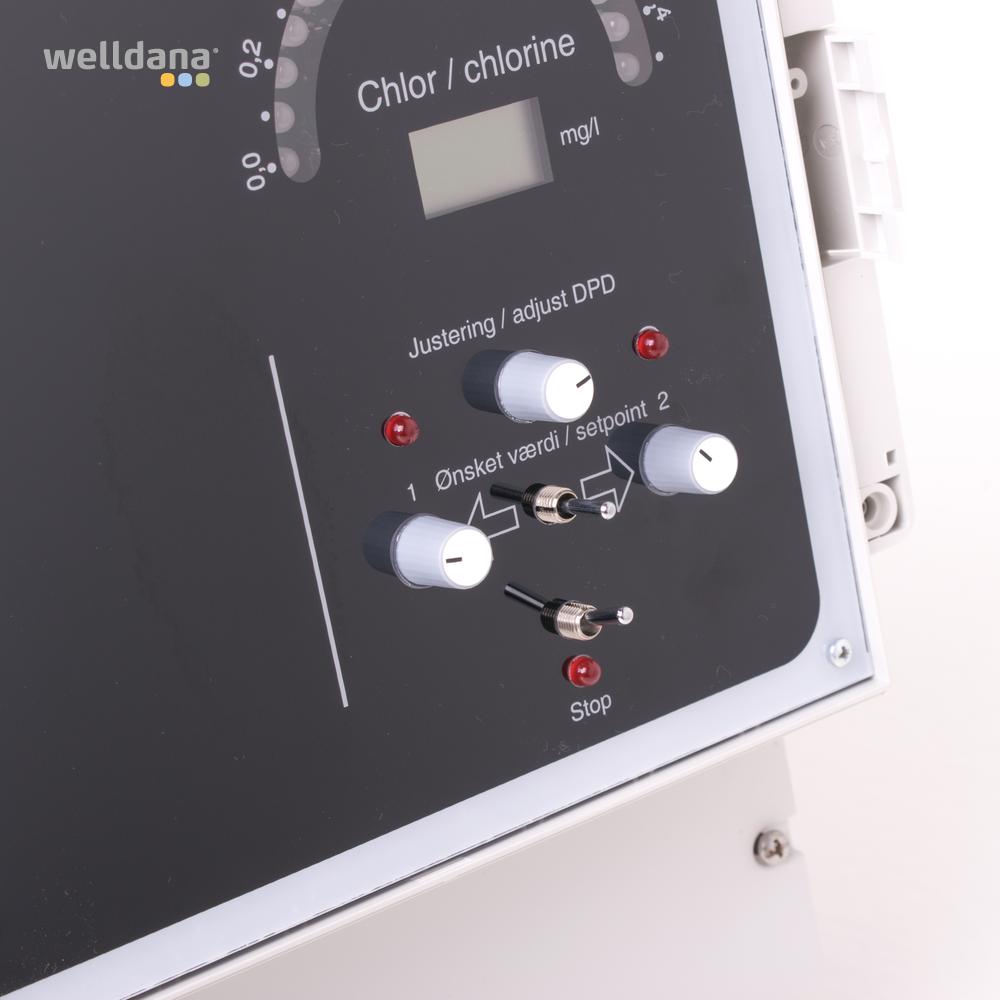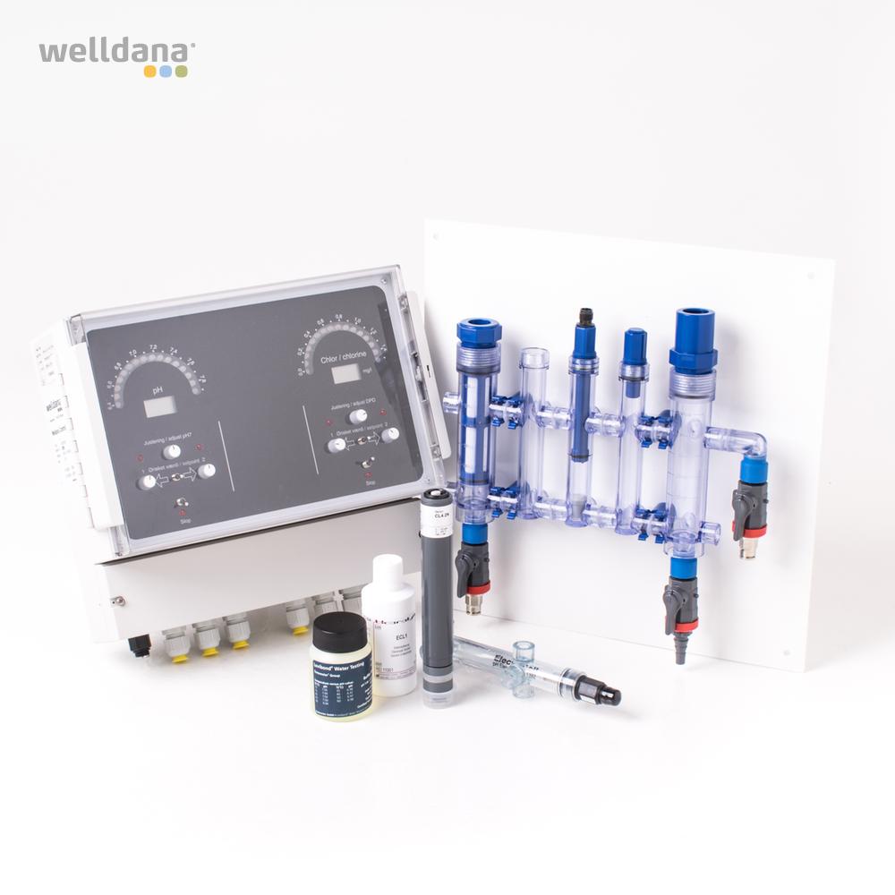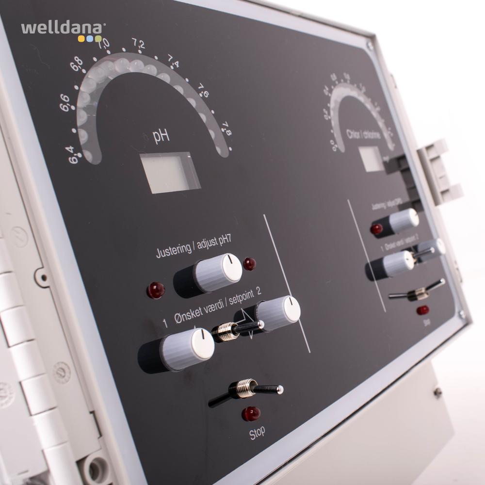 Welldana® Kemikaliekontrol laver en fuldautomatisk måling og regulering vandkvaliteten i private og offentlige pool. Den måler vandets pH-værdi og det frie klor, sammenligner målingerne med de indstillede ønskede værdier og aktiverer de tilsluttede doseringspumper, indtil de indstillede ønskede værdier er opnået. Leveres komplet med flowcelle, pH og klor sensor, slanger og monteringssæt.