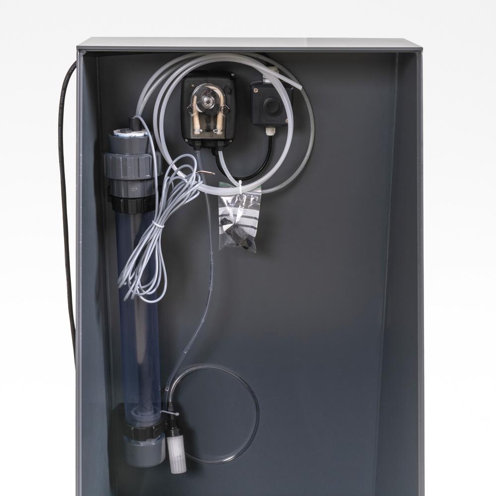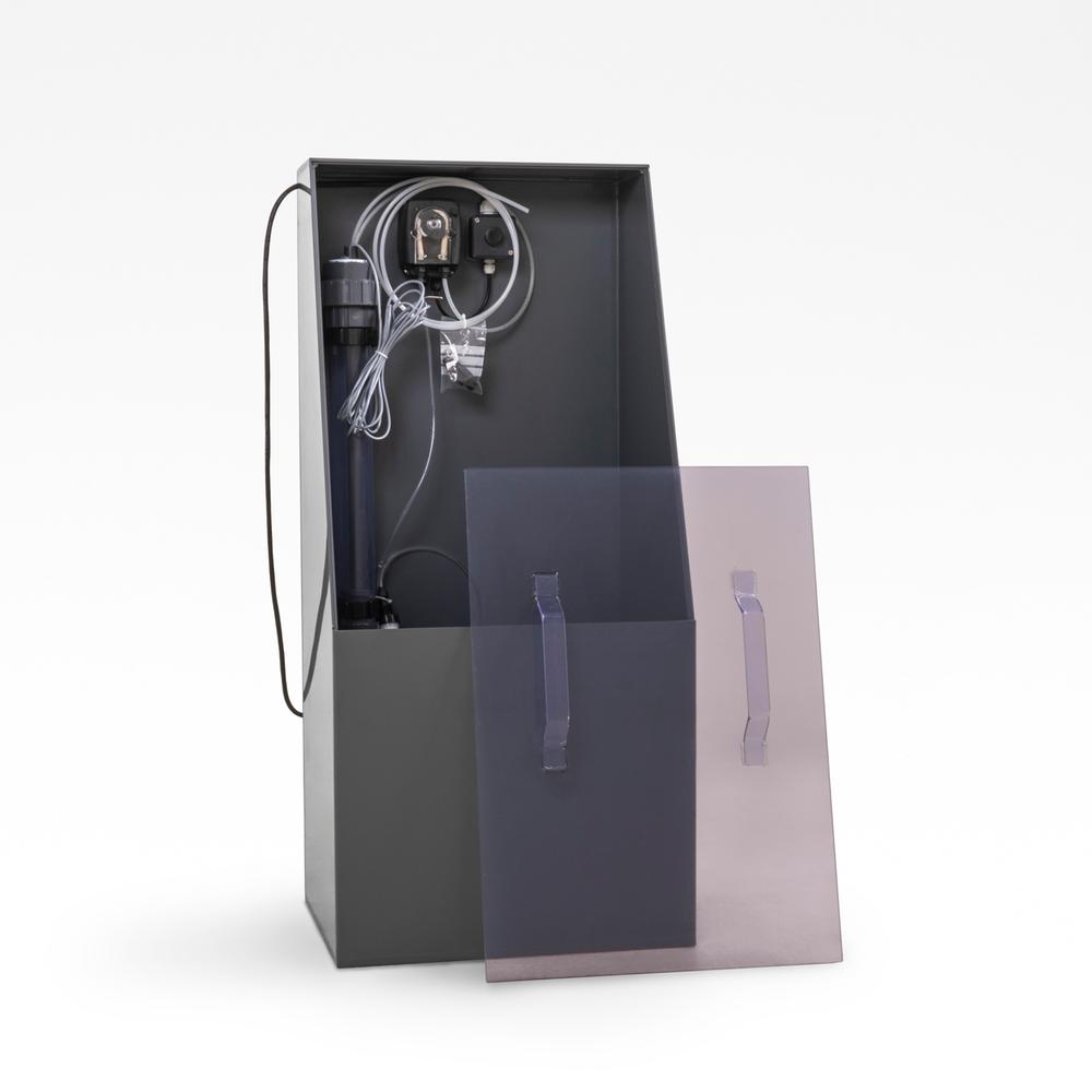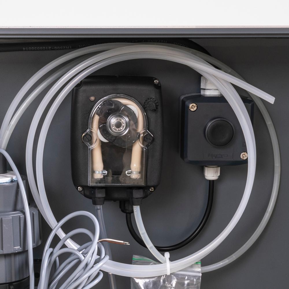 Der pumpes manuelt en mindre dosis kemi over i ugetanken, for at undgå mulighed for overdosering. Den indbygget niveau sensor tilsluttes i serie forbindelse med paddle flow switch.