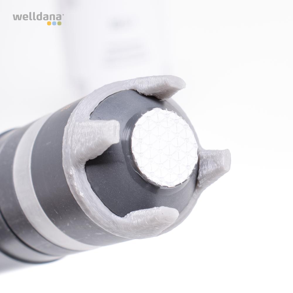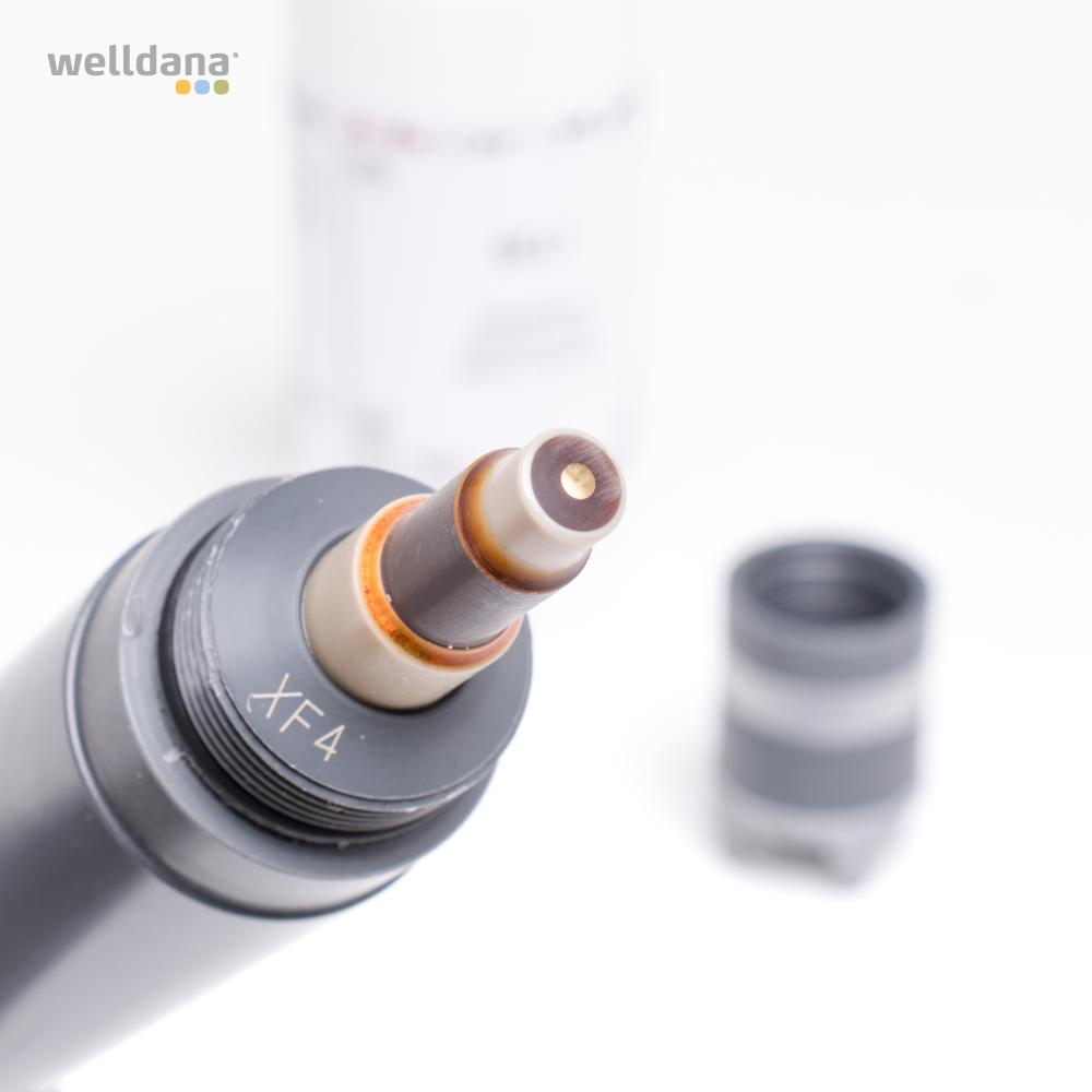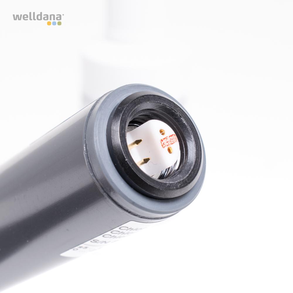 Udskiftning sensor for klor til Welldana kemi kontroller. Når sensoren udskiftes, er det vigtet at fylde membrankappen med elektrolytvæske og sætte sensoren forsigtigt og lodret ned i det lille hul. Overskydende elektrolytvæske vil løbe ud af hullet i siden af membrankappen.