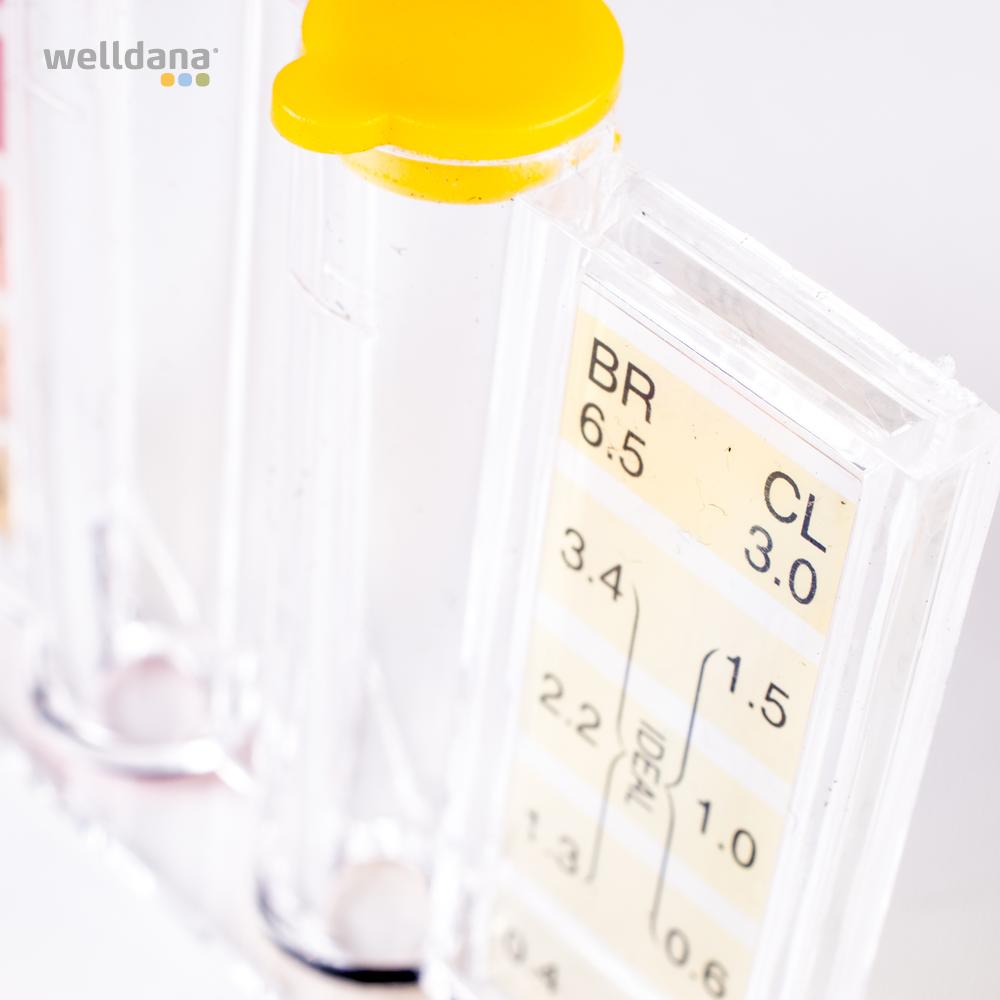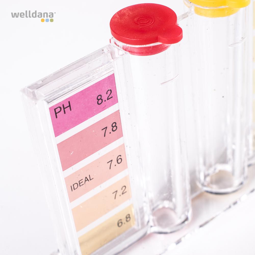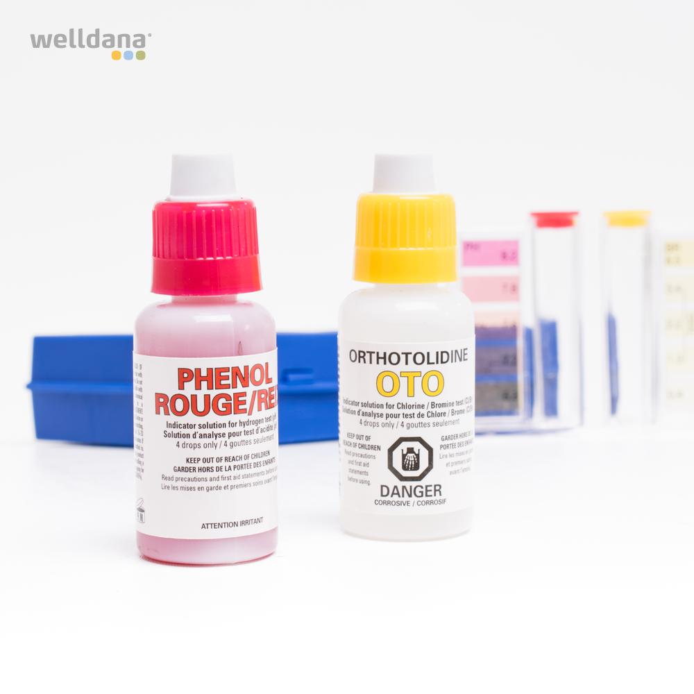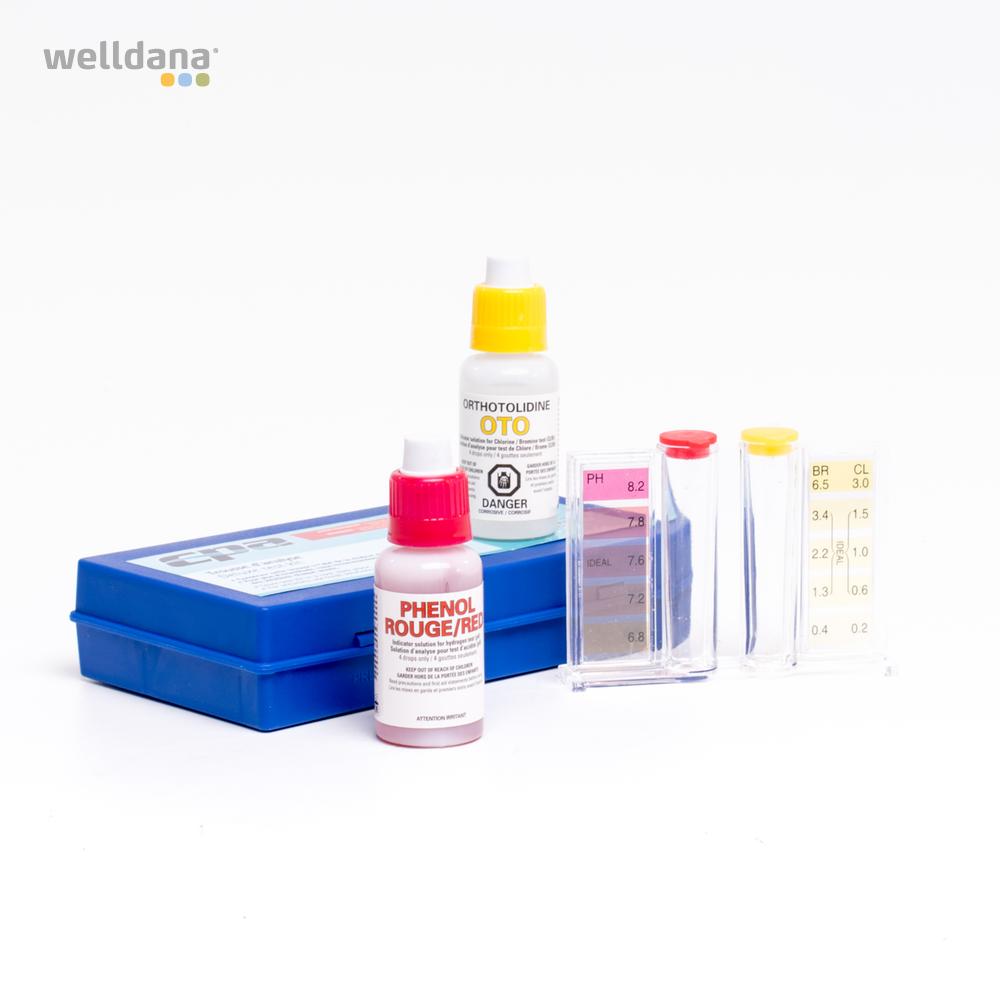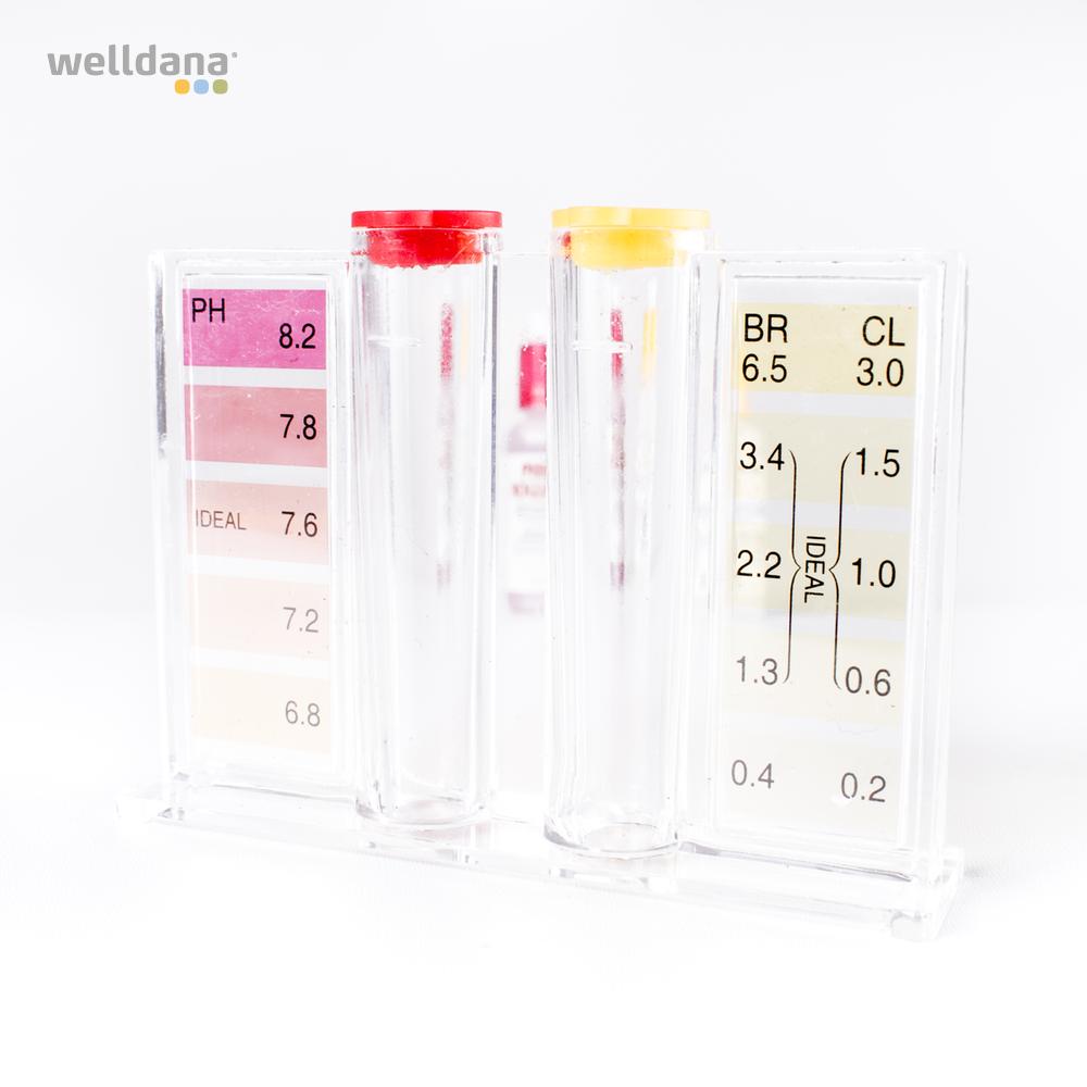 Testsæt til hurtig måling og let aflæseligt resultat af pH og klor værdierne i poolvandet. Leveres komplet med smart transparent 2-delt plastbeholder med låg, trykt farve værdiskema på fronten. Der er 2 flasker af hver type tablet, til opløsning i vandet. Super let at bruge, både for private og professionelle: