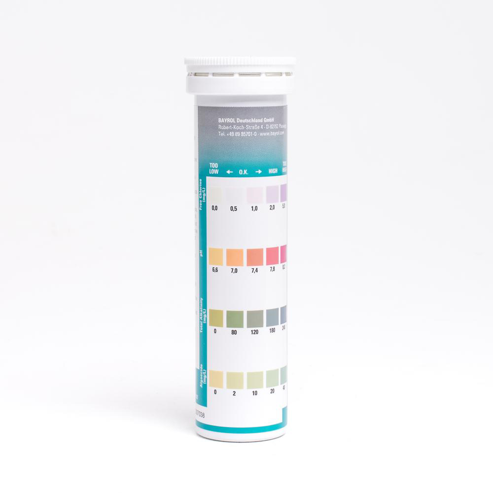 Måler frit klor, brom, pH, alkalinitet og indhold af Bayrol algemiddel Clarifyer .